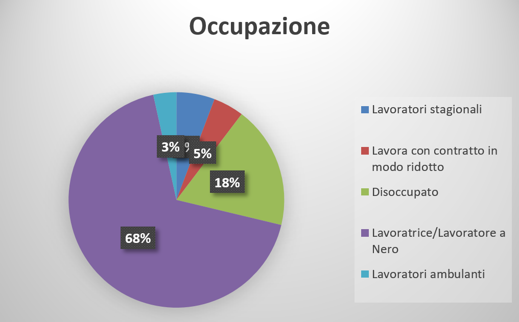 Per le fonti di sostentamento si rileva una percentuale altissima di lavoratori a nero che nella maggior parte dei casi oggi non lavora più o comunque non ha lavorato durante il lockdown, e che si sono ritrovati durante la crisi sanitaria senza alcuna entrata, mentre sono indicati come “Disoccupato” le persone che all’inizio del lockdown non lavoravano.