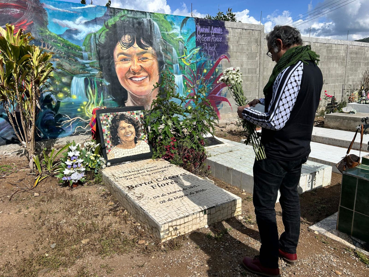 Davanti alla tomba di Berta Isabel Cáceres Flores (1971-2016) a La Esperanza, in Honduras, dove è nata e morta, ho osservato una farfalla gialla svolazzare intorno a un cespuglio di bougainvillea. Volava indifferente, passando da una tomba all’altra nel silenzioso cimitero. Accanto alla tomba di Berta c’è quella di suo fratello, Carlos Alberto López Flores (1958-2004), un comunista che ha studiato all’Università Patrice Lumumba di Mosca e che ha avuto un’influenza fondamentale sul pensiero della sorella minore. L’altro lato della tomba di Berta rimane vuoto. Attende il corpo della madre di Carlos e Berta, María Austra Bertha Flores López – conosciuta come Mamá Berta – che ha seppellito due dei suoi figli. La farfalla gialla volteggiava sopra la tomba di Berta, dove c’erano fiori freschi lasciati dai visitatori che, come noi, erano venuti a rendere omaggio a questa leggendaria combattente uccisa per aver difeso i diritti del popolo Lenca dell’Honduras e la lotta globale per la giustizia sociale.