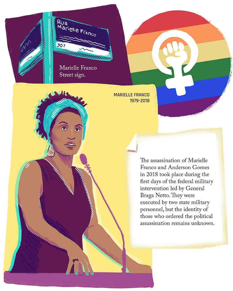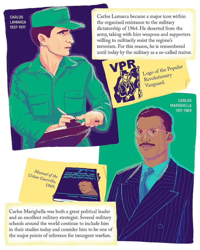 Le opere d’arte del dossier e di questa newsletter riflettono sul ruolo delle forze armate del Brasile orientate più alla repressione interna che alla difesa alle frontiere esterne del paese. Per questo le immagini evocano le coraggiose persone che hanno lottato per democratizzare il paese affrontando l’ira dei militari.