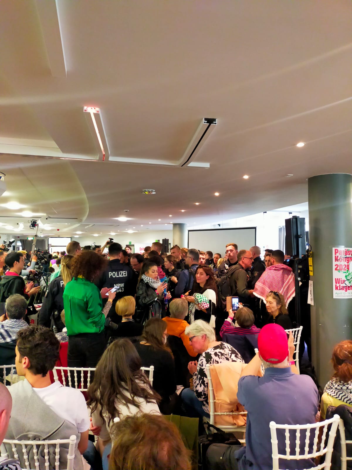 Il giorno dell’inizio della conferenza si è capito subito che non sarebbe durata a lungo: oltre 2.500 poliziotti mobilitati da diverse regioni del Paese distribuiti in città, 50 poliziotti dispiegati all’interno della sala di conferenza, accompagnati da alcuni agenti dei servizi segreti tedeschi (sic!), controllavano che venissero rispettate le “regole di condotta” imposte agli organizzatori. Dopo neanche un’ora gli agenti di polizia hanno interrotto il video messaggio di Salman Abu Sitta, attivista per la pace palestinese e padre di Ghassan Abu Sitta, famoso chirurgo plastico e ricostruttivo eletto rettore dell’Università di Glasgow il 24 marzo 2024. Proprio quest’ultimo doveva partecipare fisicamente alla conferenza, ma in mattinata era stato fermato all’aeroporto di Berlino e rispedito in Scozia con un Betätigungsverbot, cioè un divieto di ogni forma di attivismo politico in territorio tedesco. Una tale divieto era stato imposto anche a Yanis Varoufakis il giorno prima.