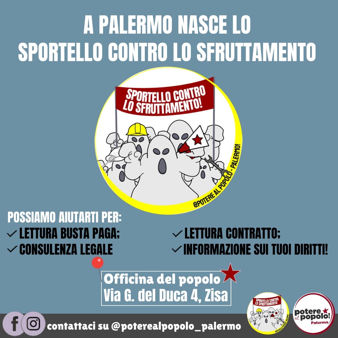 Da oggi, Potere al Popolo Palermo dispone di uno sportello legale a sostegno di lavoratori e lavoratrici costrett a lavorare in nero o in grigio (nel caso di chi un contratto ce l’ha ma non risponde alle vere condizioni di lavoro), sotto ricatto, in condizioni precarie, con un salario misero al fine di porre fine a sfruttamenti e riprenderci i diritti che ci spettano.