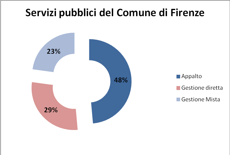I servizi appaltati sono praticamente tutti quelli in cui non prevale il lavoro amministrativo. Infatti, soltanto il 29% delle attività comunali che la stessa amministrazione definisce “a gestione interna” sono effettivamente erogate dal comune e si possono elencare senza annoiarsi: Ausilioteca, Canile, Rilascio tesserini caccia, Rilascio ZTL permessi, Servizi alle imprese, Servizi cimiteriali, servizi demografici, Sportello alterazioni e occupazioni della viabilità, Università dell’età libera, Urp.
