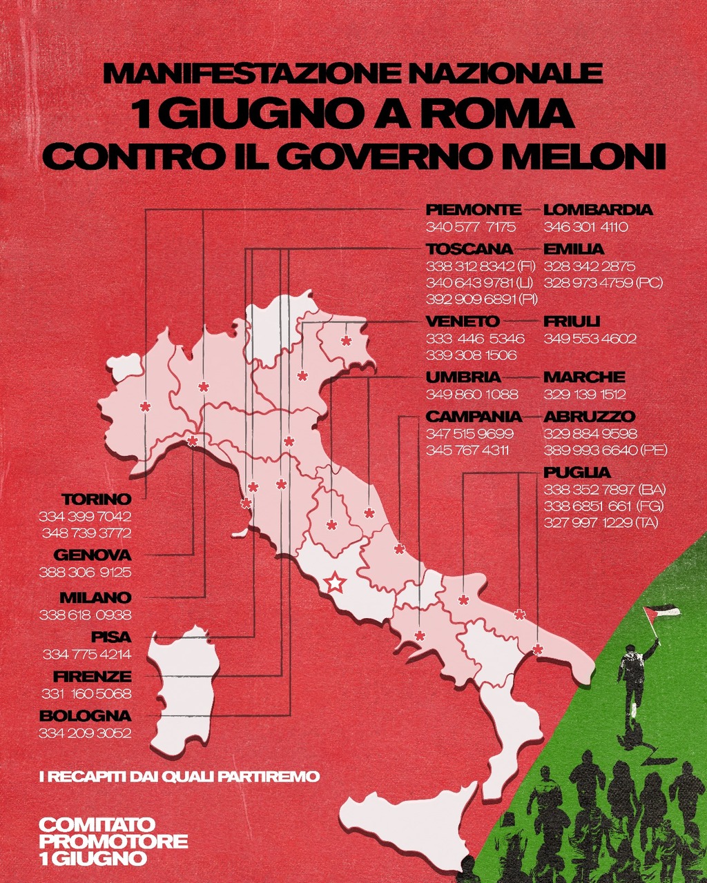 Sono decine i pullman organizzati per partecipare alla manifestazione del 1° giugno a Roma contro il Governo Meloni.